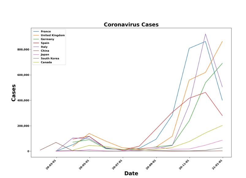 In the same vein, the one below shows the number of cases per month in 2020 for the same countries: