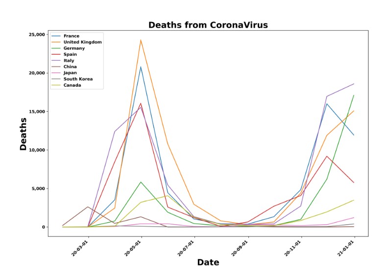 The figure below shows the total number of deaths per month in 2020 for some countries in Western Europe, Asia and North America: