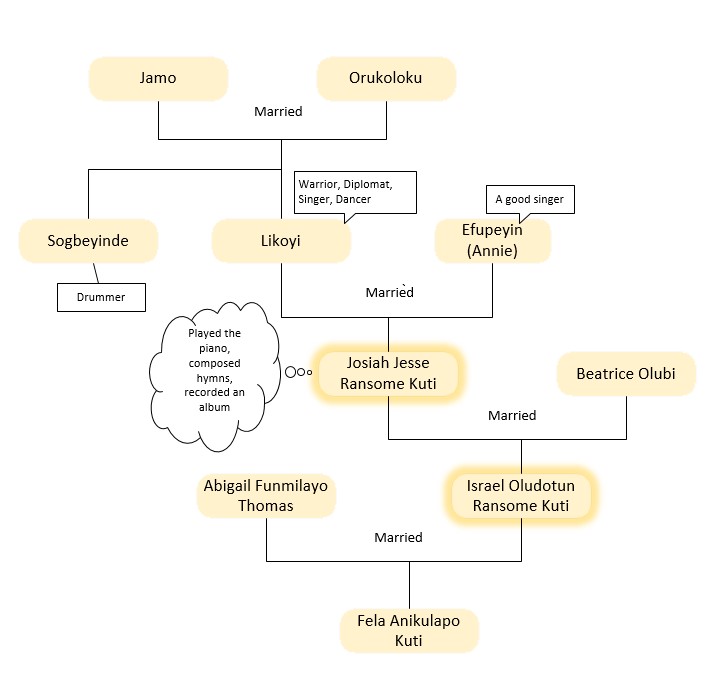 Not much was said about Jamo, apart from having two sons, Likoyi and Sogbeyinde. Likoyi was described as one of Egbas’ greatest diplomats and a weaver by trade. The Egbas are a people group in the South West of Nigeria. Likoyi’s hobbies included singing and dancing. Sogbeyinde was described as a singer and dancer. To produce two sons who were musical, it is probably likely that Fela’s great, great grandfather himself was musical.