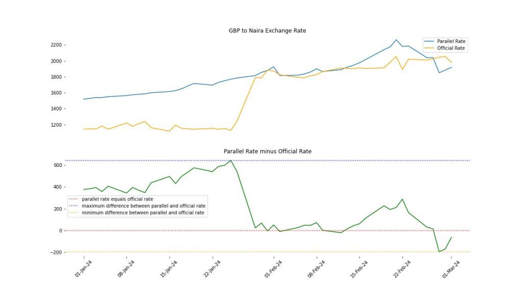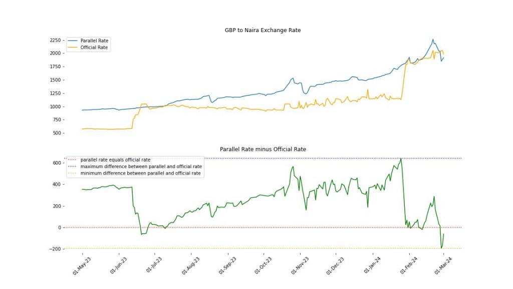 The chart at the top plots the parallel and official exchange rate of the British Pound to the Naira between 1 May 2023 and 1 March 2024. The one at the bottom plots the difference between them. They are both complementary.